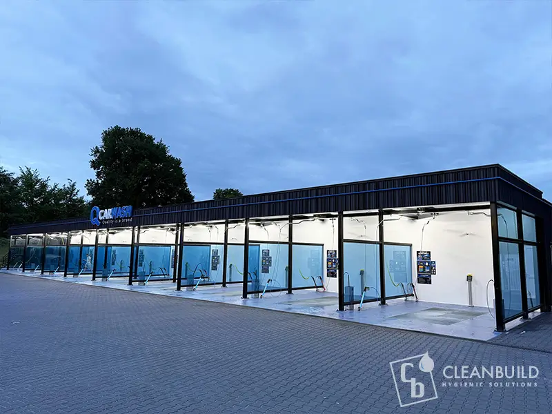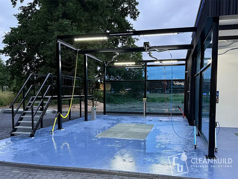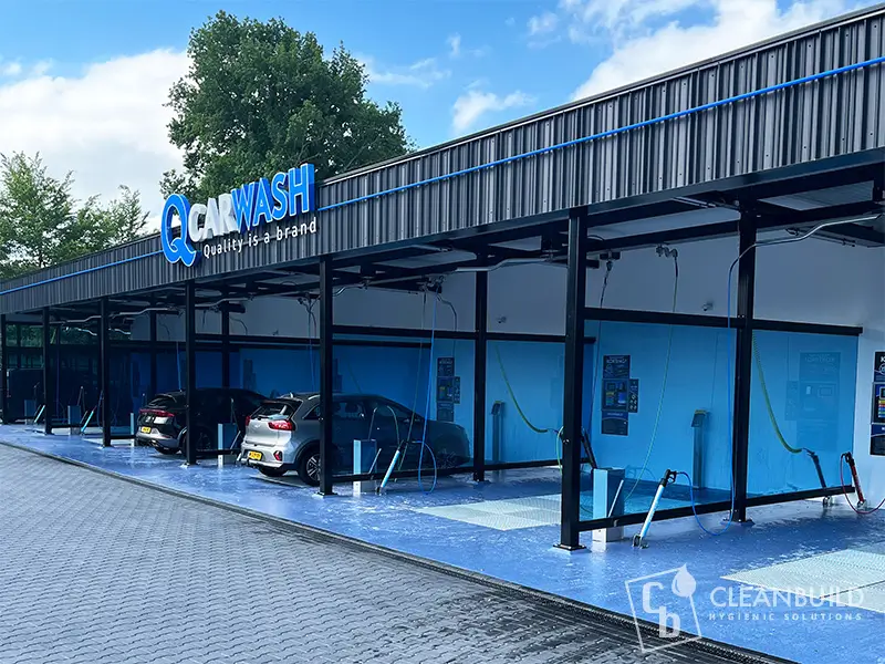 Pour QCarwash à Harderwijk, aux Pays-Bas, Cleanbuild a conçu le mur adjacent aux postes de lavage en panneaux PVC Cleanpanel. Ce mur est situé dans la zone technique.